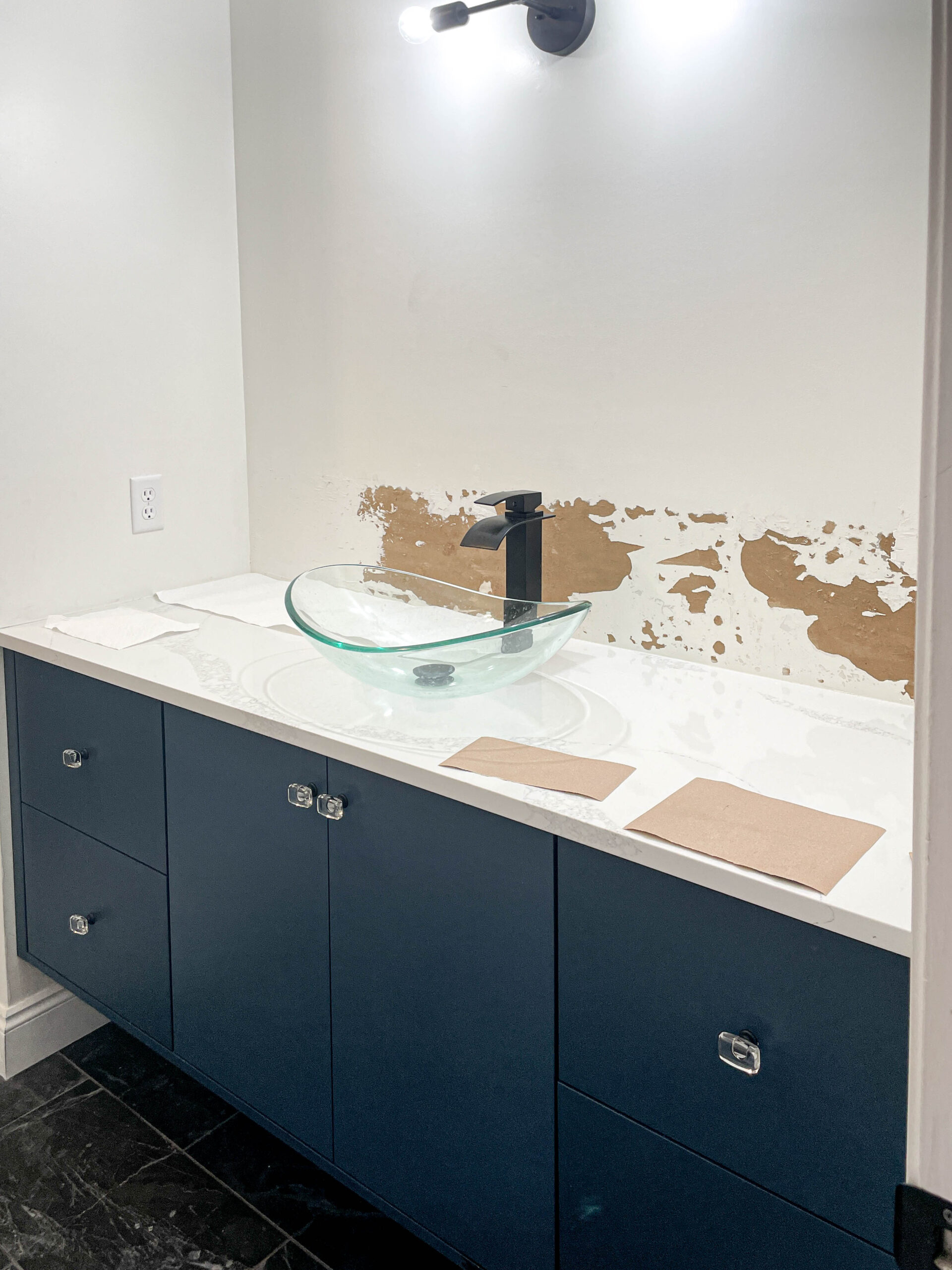 We ended up going with it because we knew a mirror would sit over the seam that wasn't totally perfect anyway. You can't win 'em all right?